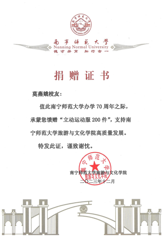 正值七秩南师之际,带着对母校的思念和祝福,四海员工如约而至,齐聚南师;共忆往昔,美好芳华!春风育桃李,桃李报春风。12月30日,太阳成集团tyc122ccvip2002级旅游管理专业员工莫燕娥向公司师生捐赠了200件运动服,助力公司教育事业发展。