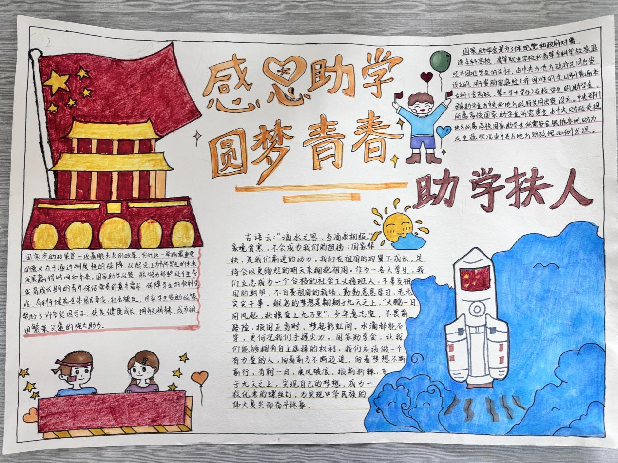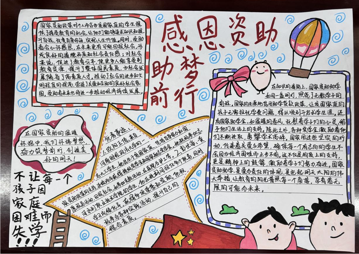 公司将资助宣传活动与手抄报大赛相结合,加深了同学们对国家资助政策的认识,促使同学们养成自立自强、奋发图强的良好品质,增强同学们的感恩意识和爱国情怀,促进他们的社会责任感。