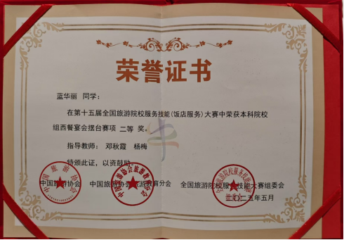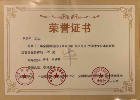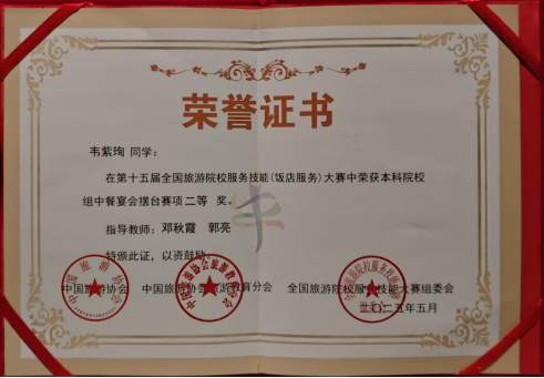 5月14日至18日在郑州盛大举办的第十五届全国旅游院校服务技能(饭店服务)大赛中,公司太阳成集团tyc122ccvip的3位参赛选手凭借卓越表现脱颖而出,在全国众多强手中崭露头角,为公司赢得了荣誉。其中,蓝华丽同学在本科院校组西餐宴会摆台赛项中荣获二等奖,韦紫珣同学在本科院校组中餐宴会摆台赛项中斩获二等奖,吴俊松同学在本科院校组客房服务赛项中获得三等奖。